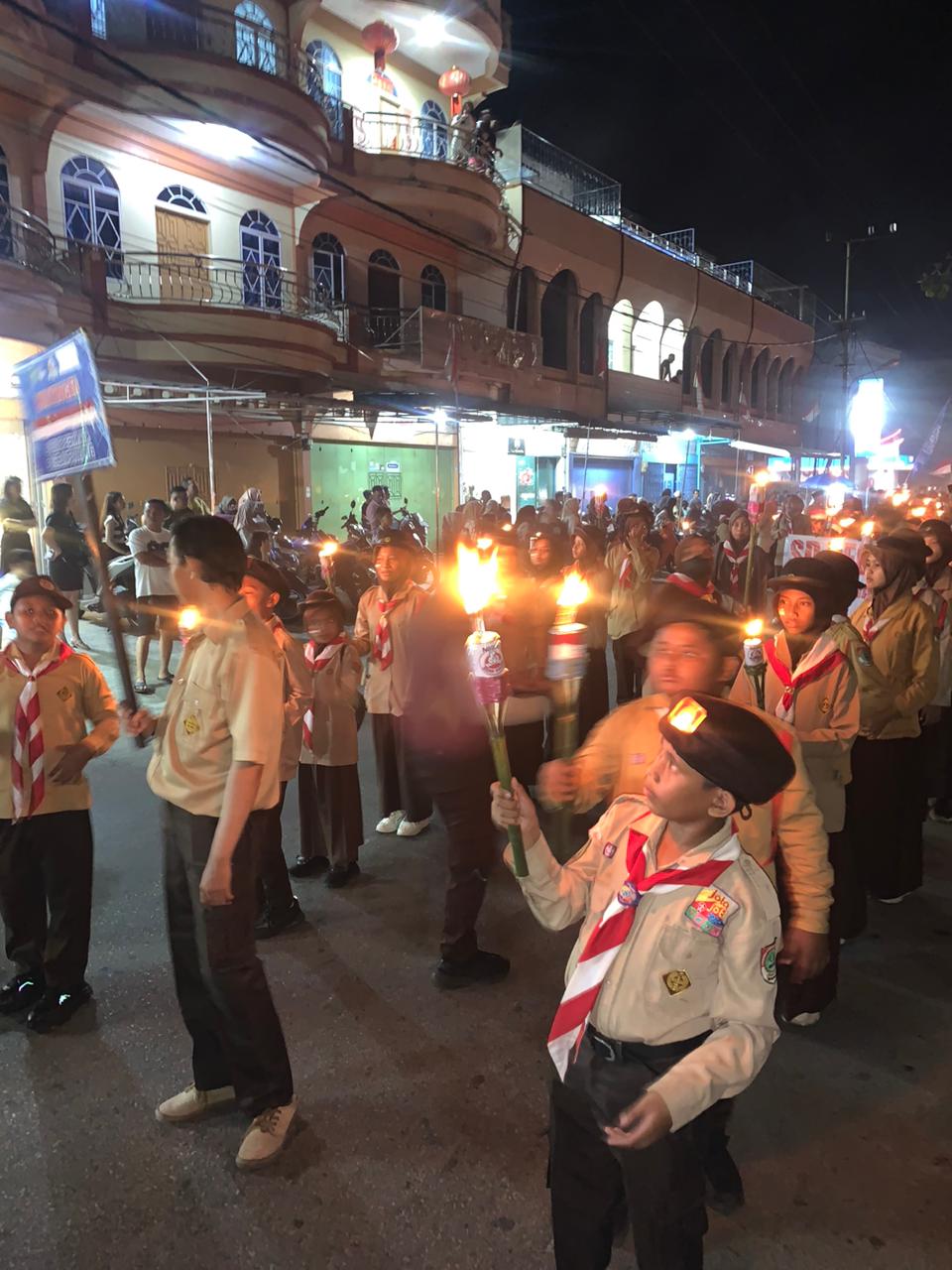 Dengan membawa obor yang menyala, para peserta berjalan menyusuri jalanan kota, menciptakan pemandangan yang indah dan penuh makna.