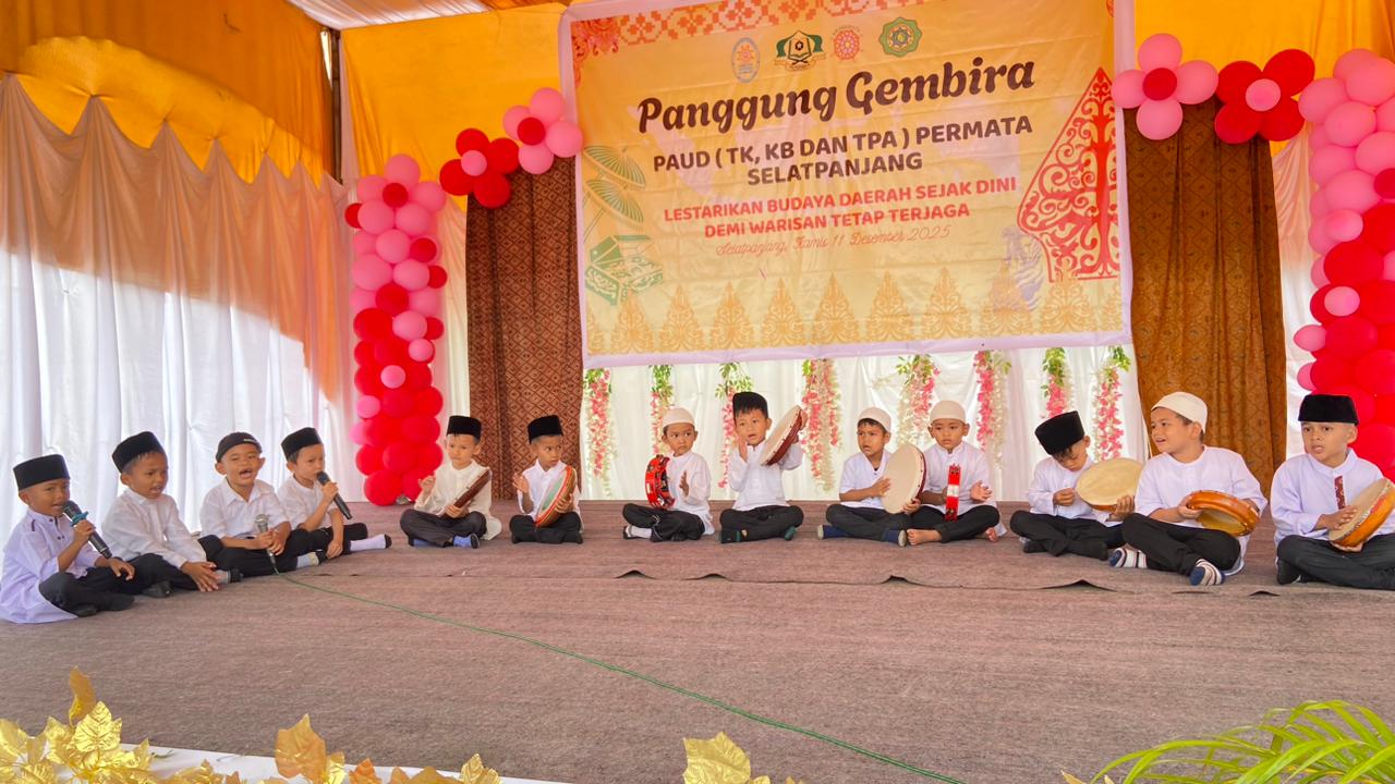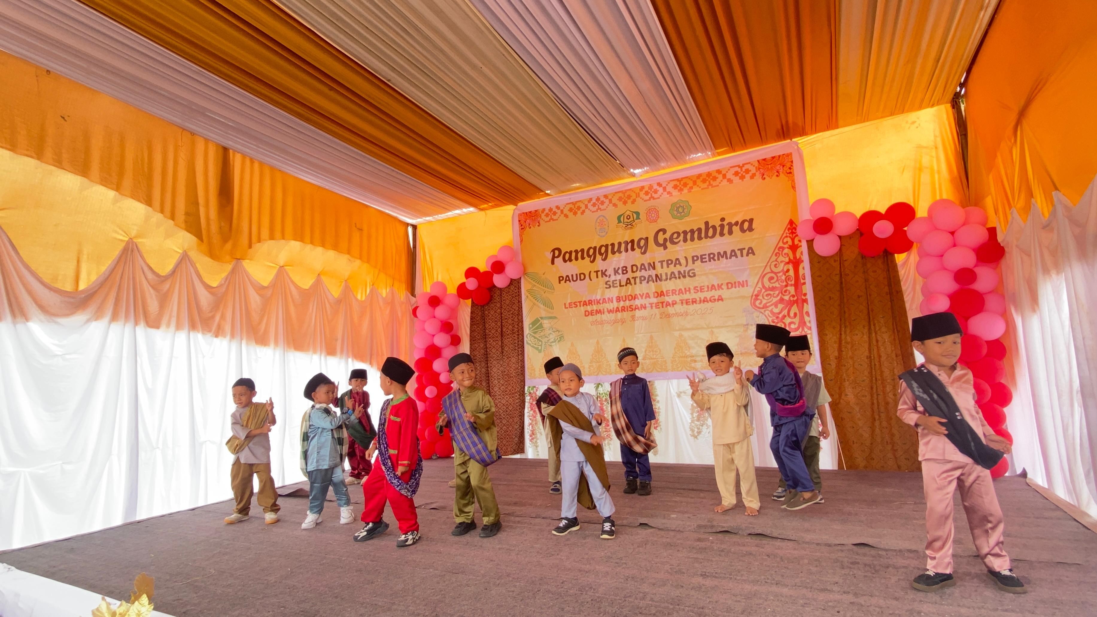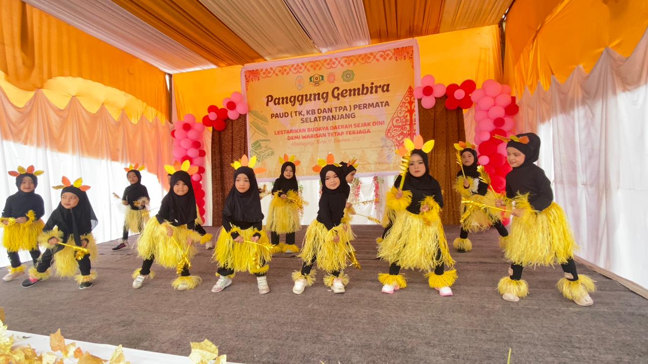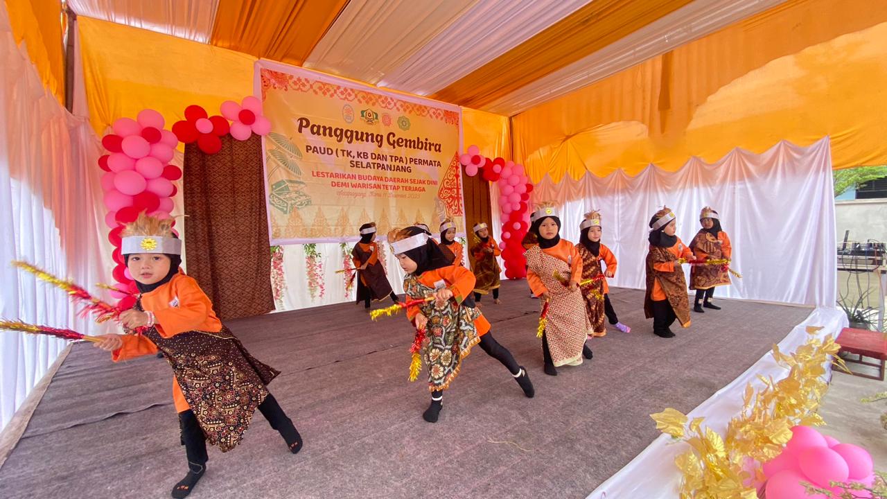 Kegiatan Pangung Gembira yang mengusung Tema “ Lestarikan Budaya Daerah Sejak Dini demi warisa Tetap Terjaga” menghadirkan beragam Nuansa Seni daerah yang memukau serta sarat dengan pesan-pesan moral,Mulai dari Tarian Tradisional, Pertunjukan Musik Daerah,serta Kompilasi lagu dan Gerak Nada yang lincah dan Ceria , sehingga Identik dengan Karakter Peserta Didik Usia Dini, namun demikian dalam setiap kegiatan tetap di angkat Nilai agama dan Nuansa Keislaman sebagi ciri Khas dari yayasan permata sendiri, seperti cara berbusana, beberapa tampilan yang bersifat Religius serta penerapan Adap dan dan budaya sopan santun dalam setiap tampilan anak.